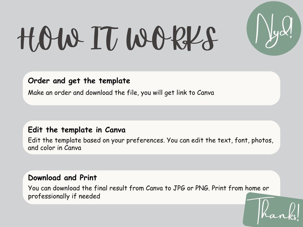 After finishing your order, download the file and you will get link to Canva. Then, you can edit text, font, photos, and color based on your preference in Canva